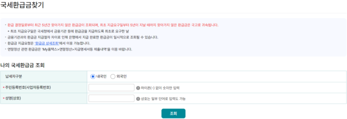 - 환급금 조회 : ‘국세환급금 찾기’를 클릭해 결과를 확인합니다.