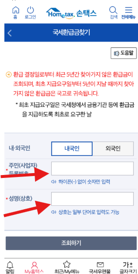 - 정보 입력 : 조회 화면에서 주민등록번호(또는 사업자번호)와 성명을 입력합니다.