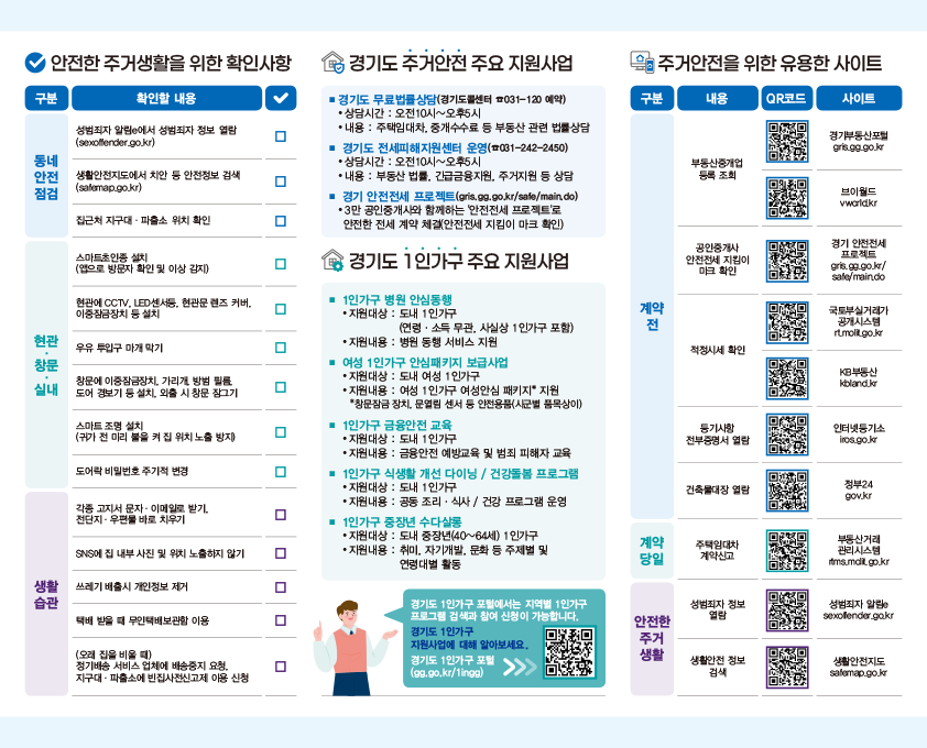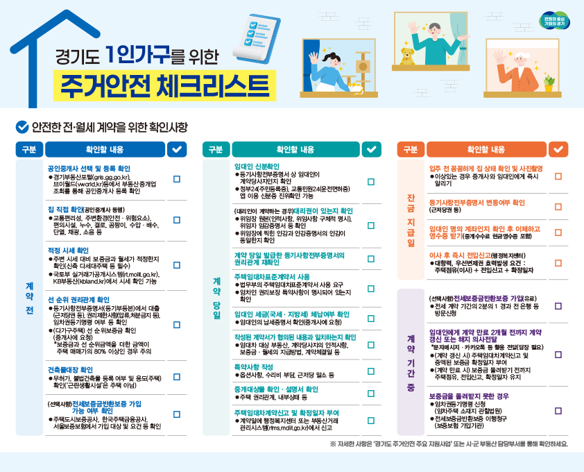 1인 가구의 안전한 주거 생활을 위해 계약 전부터 철저히 준비하고, 입주 후에도 꼼꼼한 점검을 잊지 마세요. 경기도에서 제공하는 전세 피해 지원센터와 관련 사업도 함께 확인해 보시기 바랍니다.